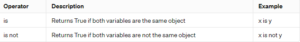 Python identification operators are used to compare items’ memory addresses as opposed to their values.